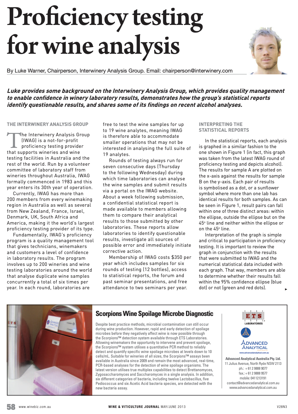Proficiency testing for wine analysis,Wine & Viticulture, May/June 2013, pp. 58-60